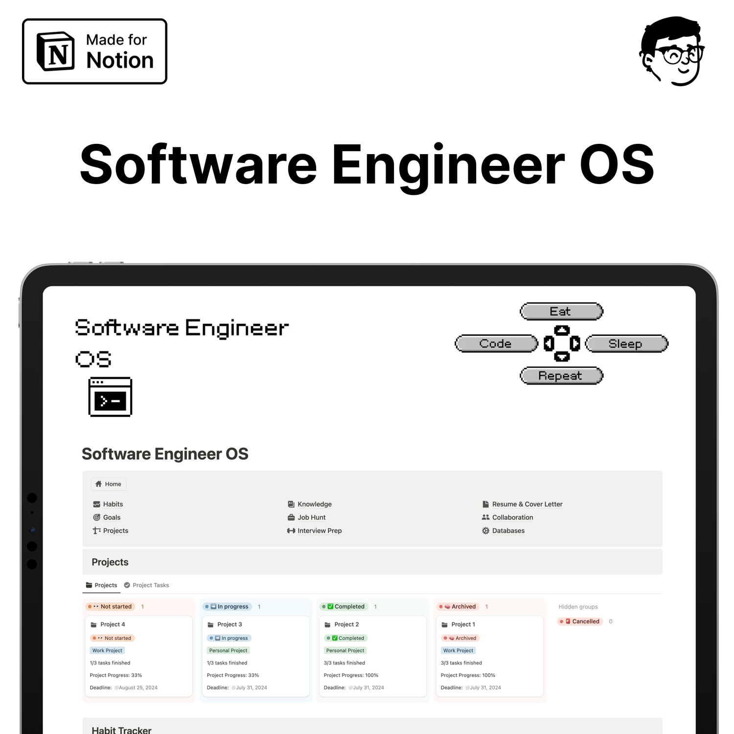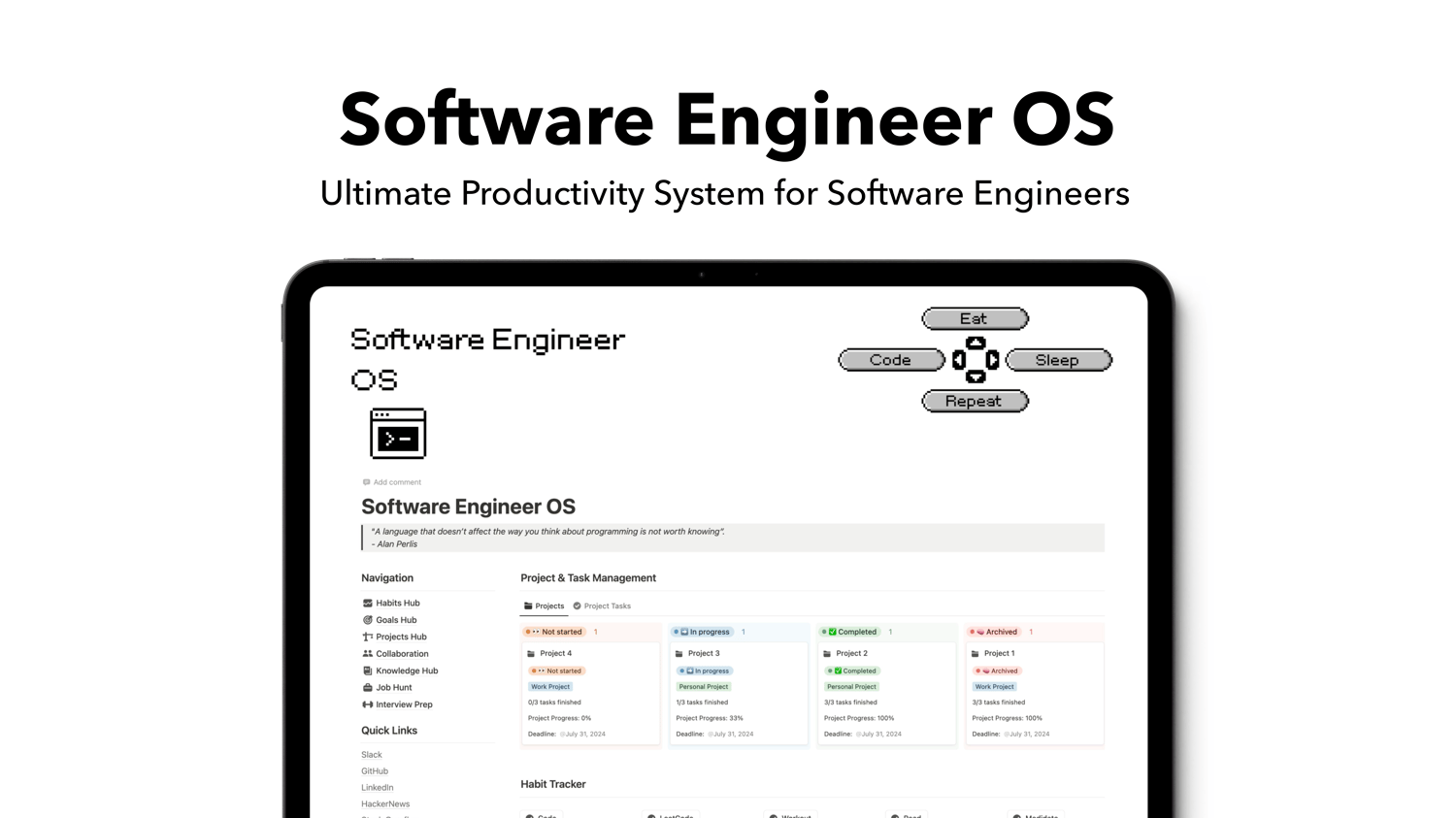 Software Engineer's Hub is a meticulously crafted system designed to help software engineers achieve peak productivity in both their personal and professional lives. Whether you're building new habits, achieving your goals, tracking projects, collaborating with others, or seeking your first or next job, this comprehensive template has everything you need. Developed and refined over two years, it’s more than just a template—it's a complete productivity system.
